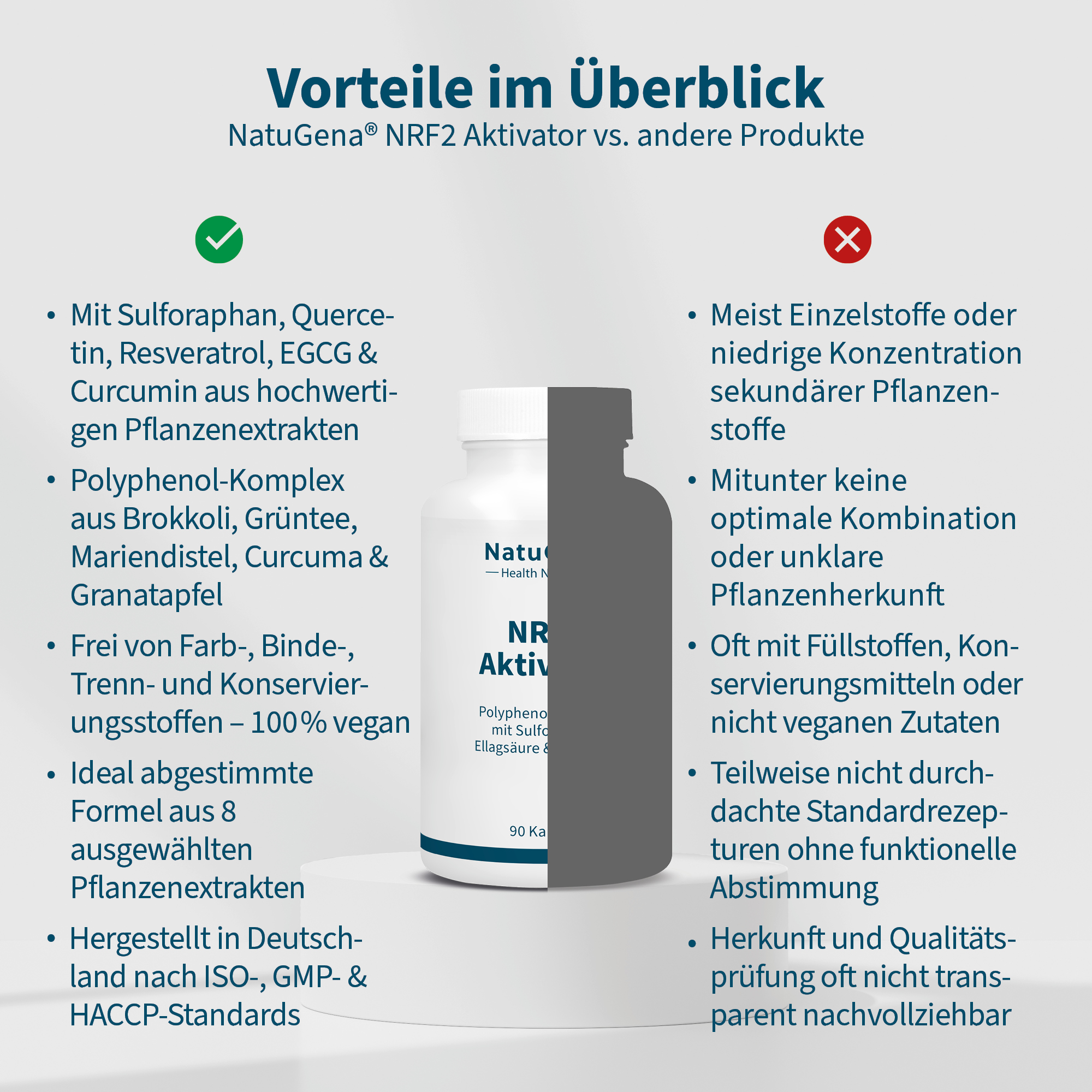 NatuGena NRF2 Aktivator enthält eine ausgewogene Kombination pflanzlicher Inhaltsstoffe: Brokkoli-Extrakt mit Sulforaphan, Grüntee-Extrakt mit Catechinen, Curcuma- und Mariendistel-Extrakt mit Curcuminoiden und Silymarin sowie Quercetin aus dem Japanischen Schnurbaum und trans-Resveratrol aus dem Japanischen Staudenknöterich. Ergänzt wird die Formulierung durch Granatapfel-Extrakt, simplicifolia und Piperin aus schwarzem Pfeffer.
