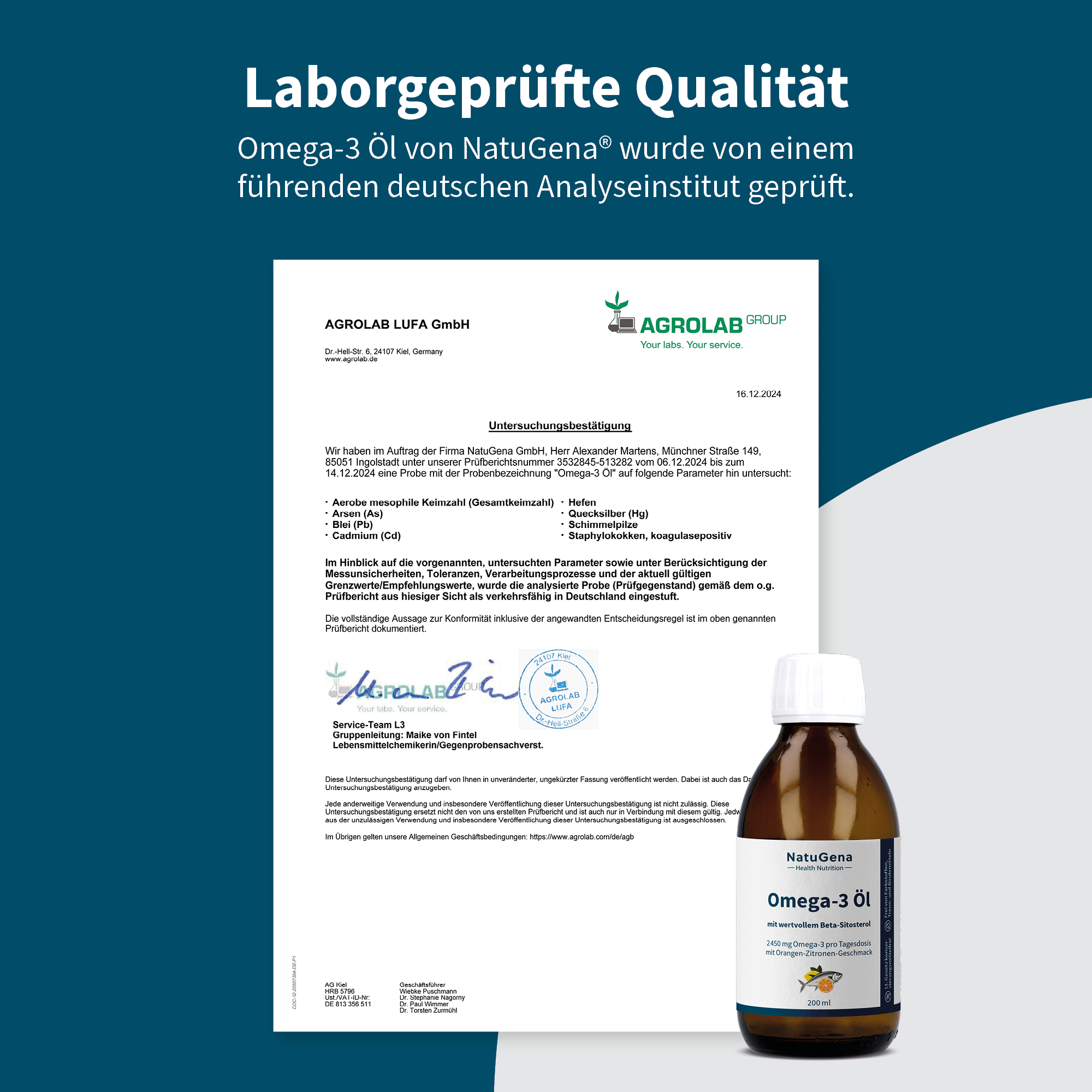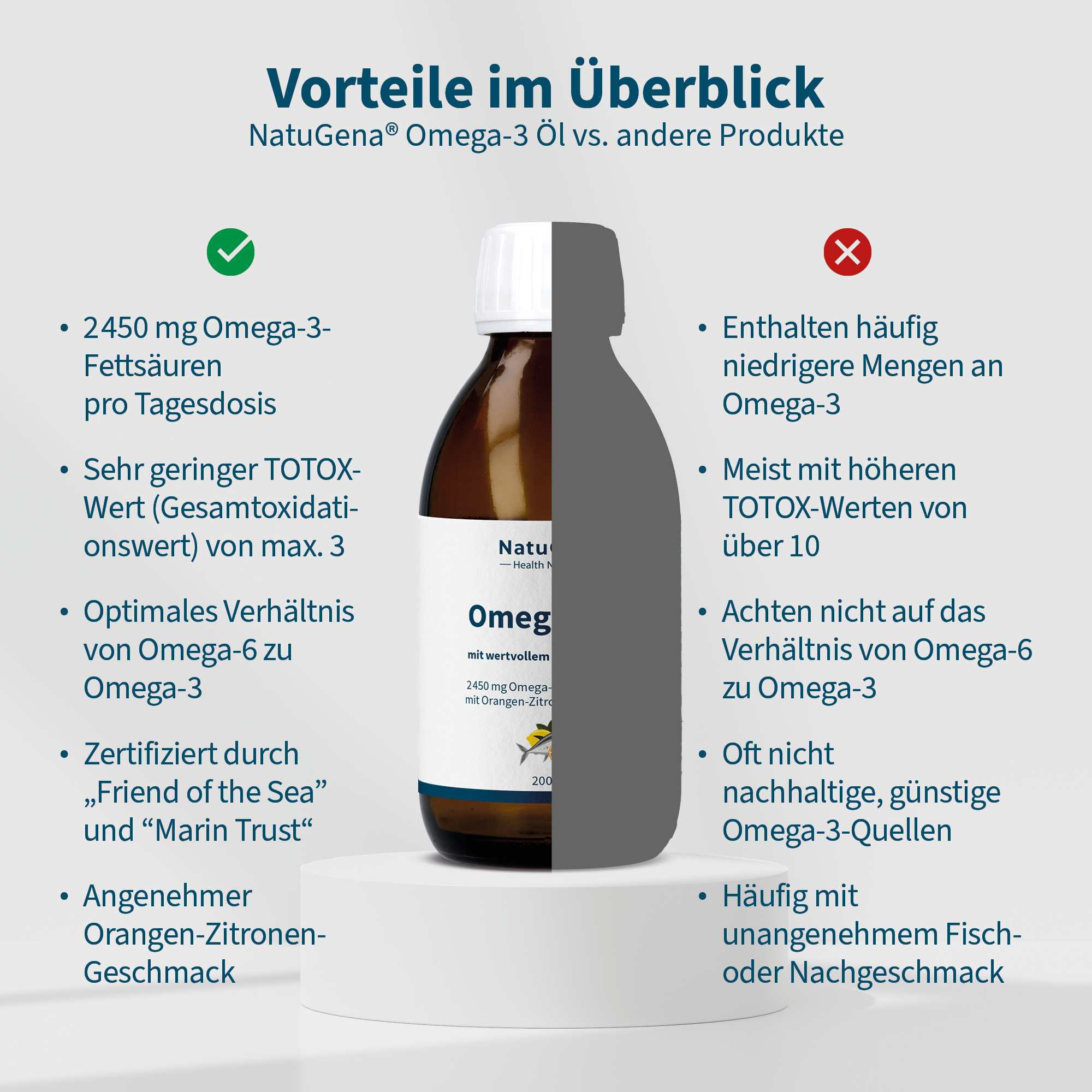 NatuGena Omega-3 Öl erfüllt und übertrifft deutsche Qualitätsstandards und bietet ein erstklassiges Produkt von höchster Qualität. Wir verwenden ausschließlich qualitative, nachhaltige und rückverfolgbare Rohstoffe, um sichere und reine Omega-3-Formeln zu erstellen. Unsere marinen Omega-3-Öle werden in Norwegen (Ålesund) hergestellt und garantieren Ihnen ein erstklassiges, sicheres und rückverfolgbares Omega-3, das klinisch dokumentiert ist.