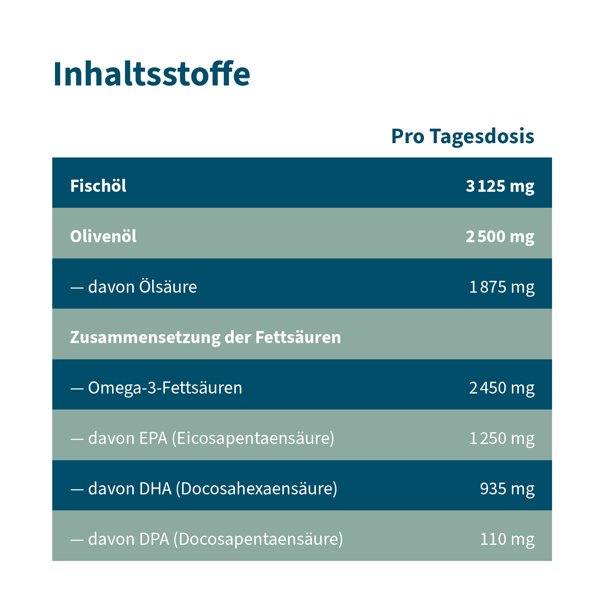 Fischöl, BIO-Olivenöl (kaltgepresst) (44 %), Aroma: natürlich aus Orange und Zitrone, Antioxidationsmittel: D-Alpha-Tocopherol.