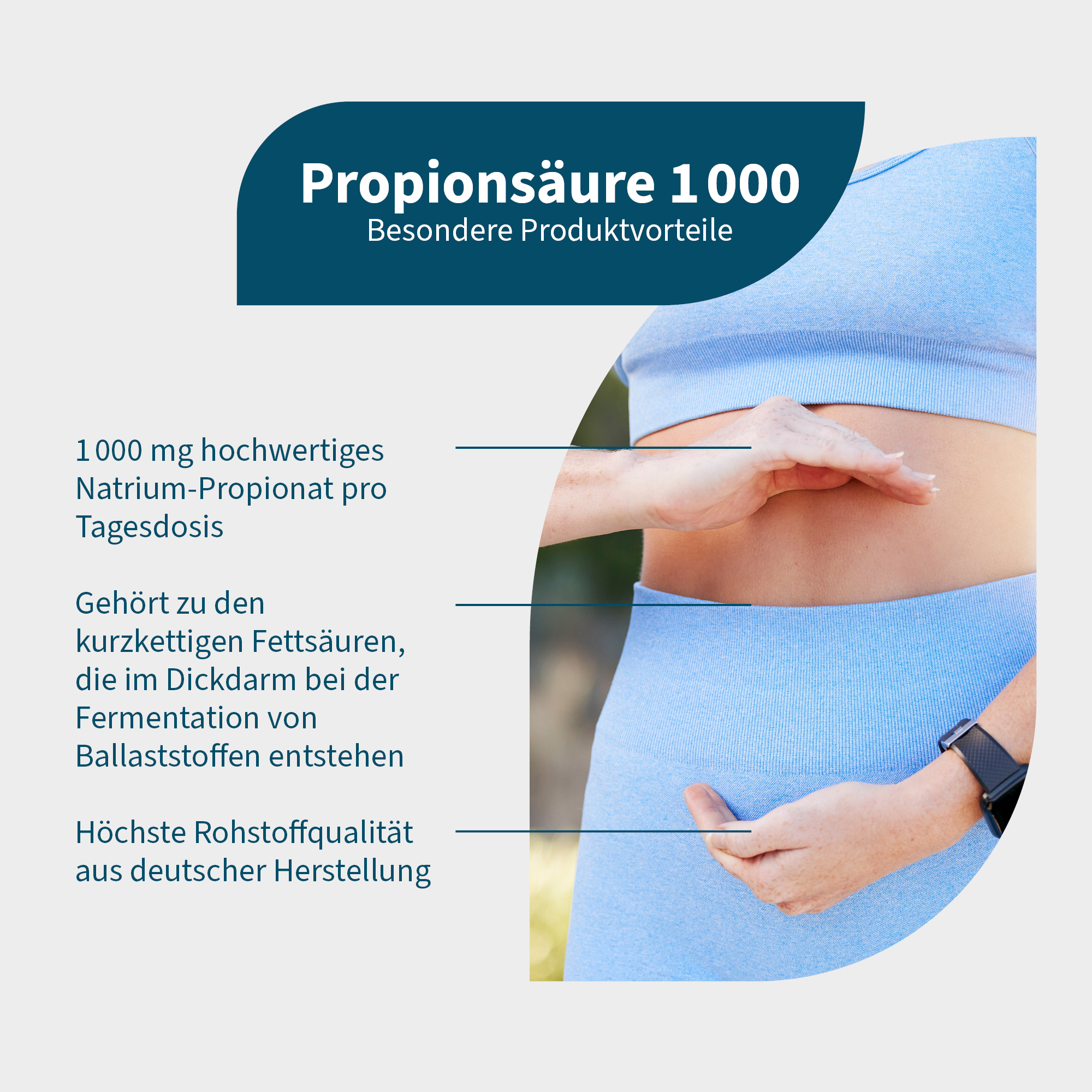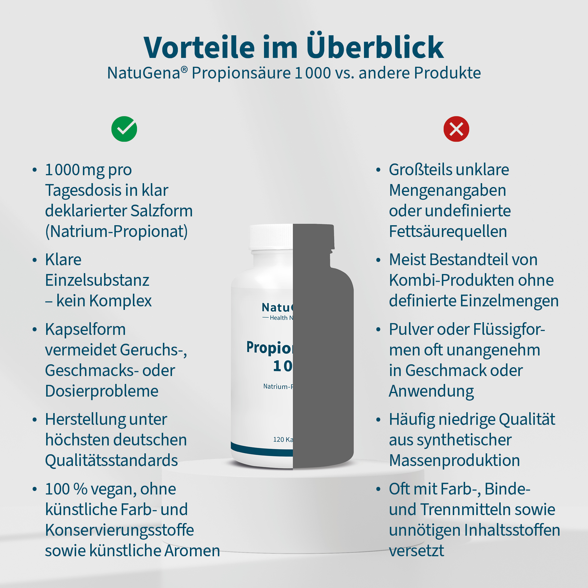 NatuGena Propionsäure 1000 enthält Natriumpropionat, die Salzform der Propionsäure. Diese Variante ist stabil und nahezu geruchlos. Im Unterschied dazu ist reine Propionsäure flüchtig und besitzt einen intensiven Eigengeruch. Natriumpropionat zerfällt im Körper wieder in Propionsäure und Natrium, ein Mineralstoff, der auch in Kochsalz vorkommt.