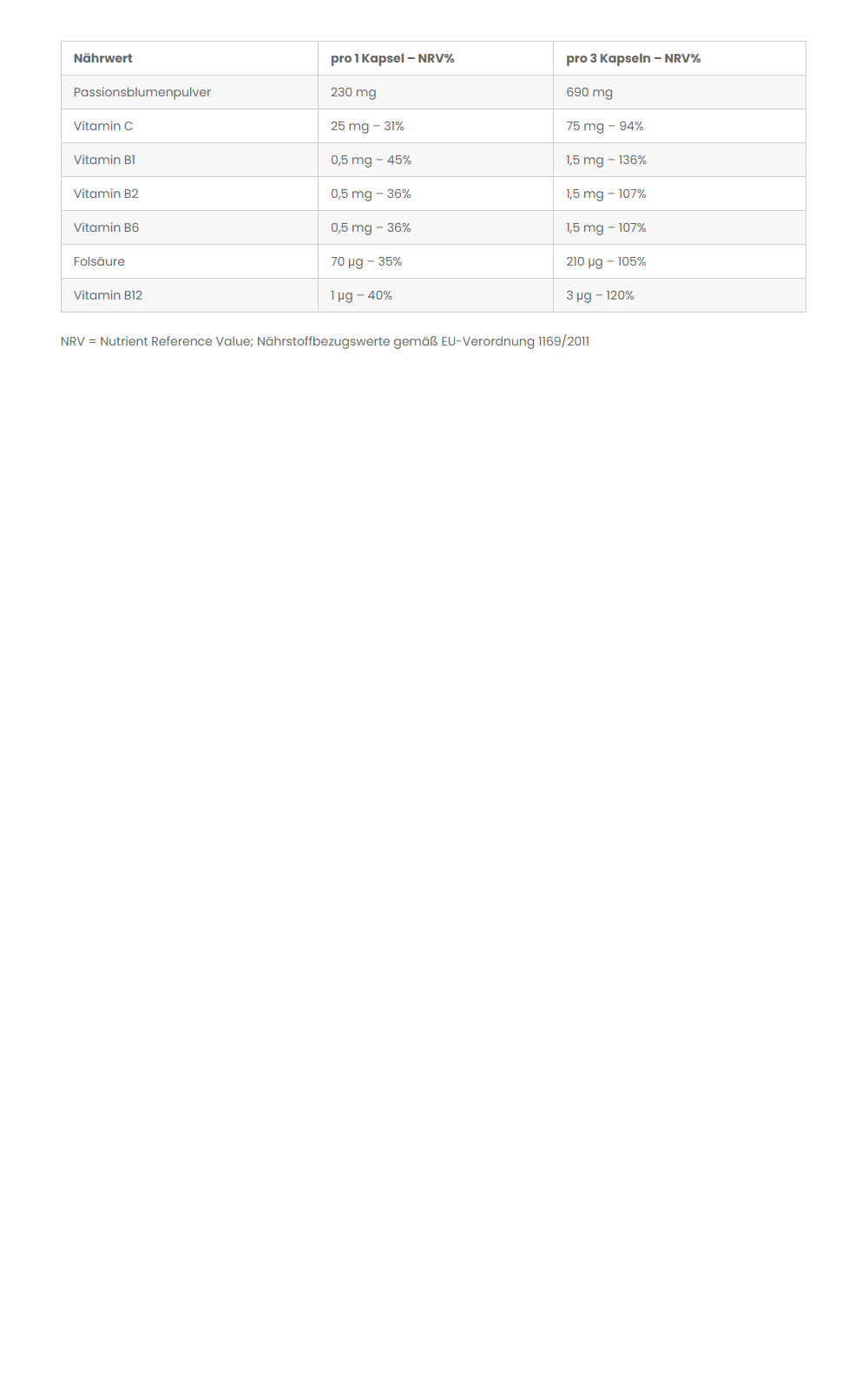 Passionsblumenpulver, Maisstärke, Hartgelatine mit Farbstoff Titandioxid, Vitamin C, Vitamin B1 als Thiaminmononitrat, Vitamin B2 als Riboflavin, Vitamin B6 als Pyridoxin, Folsäure, Vitamin B12