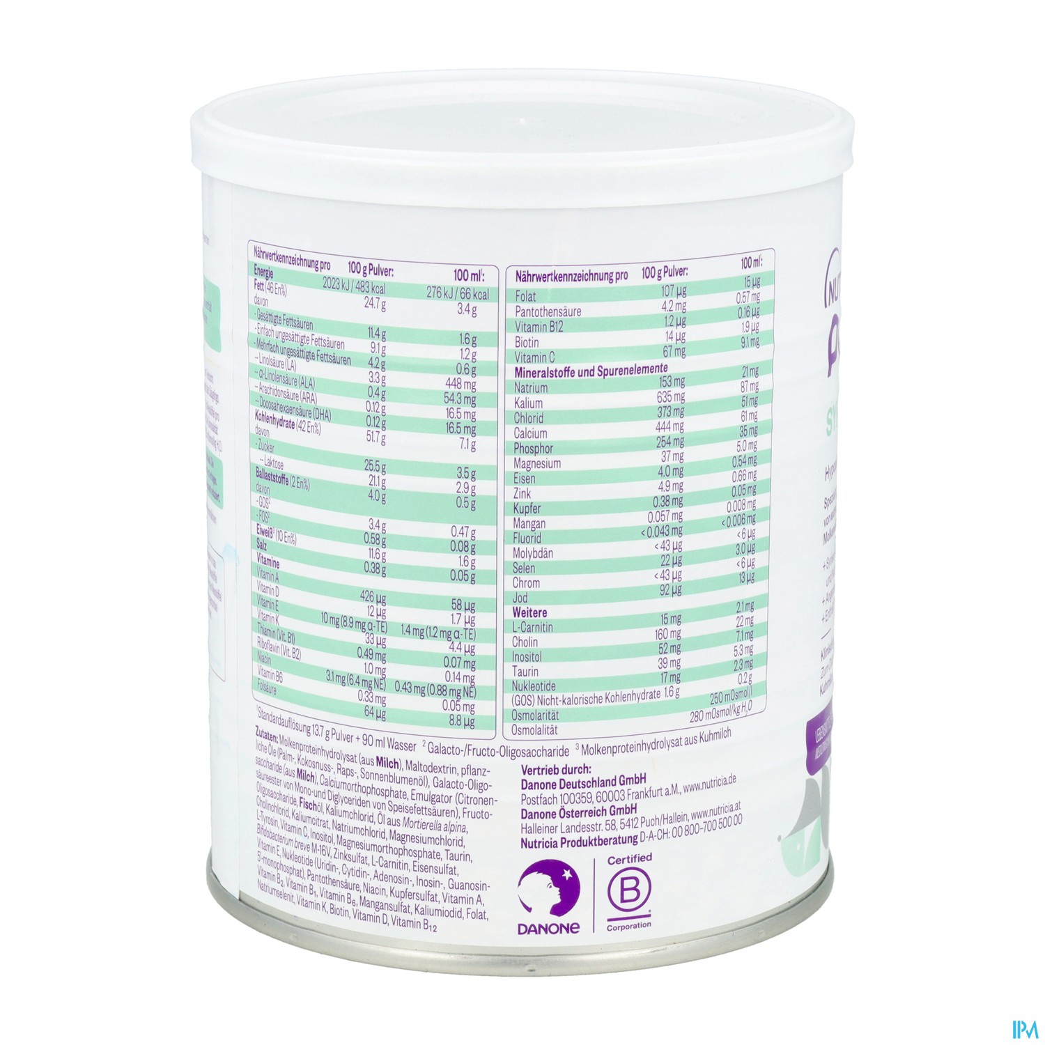 Zutaten: Molkenproteinhydrolysat (aus Kuhmilch), Maltodextrin, Pflanzenöle (Palmöl, Kokosöl, Rapsöl, Sonnenblumenöl mit hohem Ölsäuregehalt, Sonnenblumenöl), Galacto-Oligosaccharide (aus Kuhmilch), Calciumphosphat, Emulgator (Citronensäureester von Mono- und Diglyceriden von Speisefettsäuren), Fructo-Oligosaccharide, Fischöl, Kaliumchlorid, Öl aus Mortierella alpina, Cholinchlorid, Kaliumcitrat, Natriumchlorid, Magnesiumchlorid, L-Tyrosin, L-Ascorbinsäure, Inositol, Magnesiumhydrogenphosphat, Taurin, Natrium-L-ascorbat, Bifidobacterium breve M-16V, Zinksulfat, L-Carnitin, Eisensulfat, DL-alpha-Tocopherylacetat, Uridin-5'-monophosphat-Natriumsalz, Cytidin-5'-monophosphat, Calcium D-Pantothenat, Adenosin-5'-monophosphat, Inosin-5'-monophosphat-Natriumsalz, Nicotinamid, Guanosin-5'-monophosphat-Natriumsalz, Kupfersulfat, DL-alpha-Tocopherol, Retinylpalmitat, Riboflavin, Thiaminhydrochlorid, Pyridoxinhydrochlorid, Mangansulfat, Kaliumiodid, Pteroylmonoglutaminsäure, Retinylacetat, Natriumselenit, Phytomenadion, D-Biotin, Cholecalciferol, Cyanocobalamin.