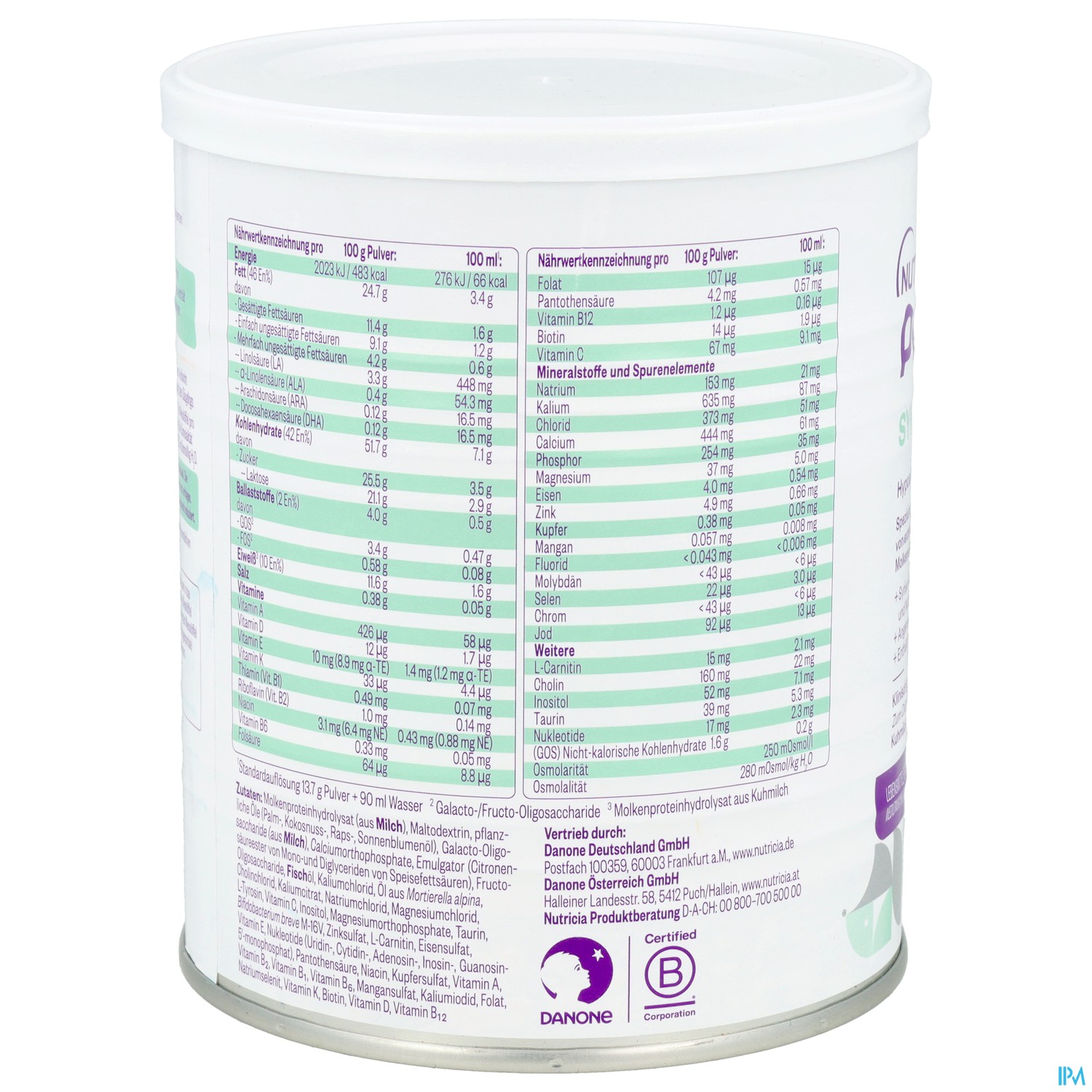 Zutaten: Molkenproteinhydrolysat (aus Kuhmilch), Maltodextrin, Pflanzenöle (Palmöl, Kokosöl, Rapsöl, Sonnenblumenöl mit hohem Ölsäuregehalt, Sonnenblumenöl), Galacto-Oligosaccharide (aus Kuhmilch), Calciumphosphat, Emulgator (Citronensäureester von Mono- und Diglyceriden von Speisefettsäuren), Fructo-Oligosaccharide, Fischöl, Kaliumchlorid, Öl aus Mortierella alpina, Cholinchlorid, Kaliumcitrat, Natriumchlorid, Magnesiumchlorid, L-Tyrosin, L-Ascorbinsäure, Inositol, Magnesiumhydrogenphosphat, Taurin, Natrium-L-ascorbat, Bifidobacterium breve M-16V, Zinksulfat, L-Carnitin, Eisensulfat, DL-alpha-Tocopherylacetat, Uridin-5'-monophosphat-Natriumsalz, Cytidin-5'-monophosphat, Calcium D-Pantothenat, Adenosin-5'-monophosphat, Inosin-5'-monophosphat-Natriumsalz, Nicotinamid, Guanosin-5'-monophosphat-Natriumsalz, Kupfersulfat, DL-alpha-Tocopherol, Retinylpalmitat, Riboflavin, Thiaminhydrochlorid, Pyridoxinhydrochlorid, Mangansulfat, Kaliumiodid, Pteroylmonoglutaminsäure, Retinylacetat, Natriumselenit, Phytomenadion, D-Biotin, Cholecalciferol, Cyanocobalamin.