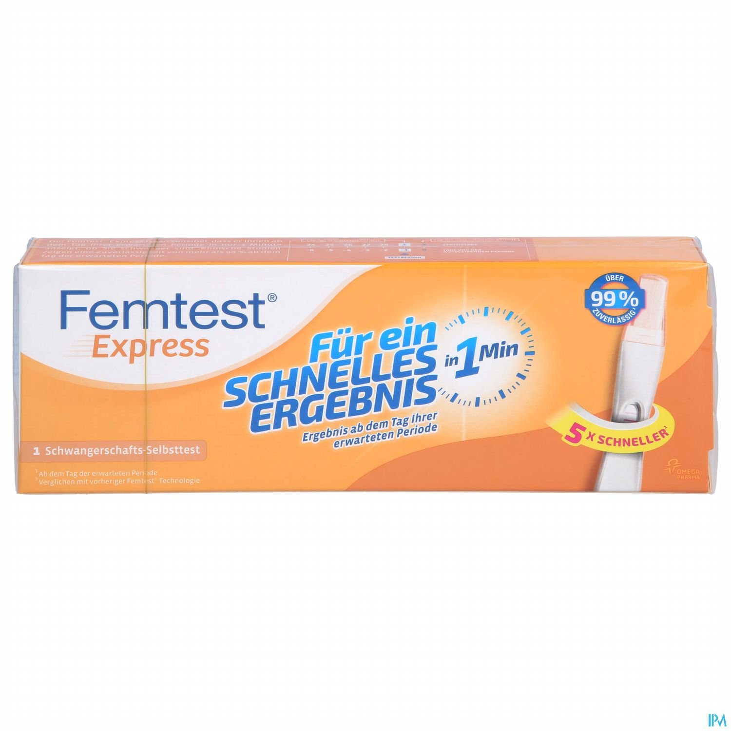 Femtest Express SchwangerschaftstestDer Femtest Express ist so sensibel, dass er Ihnen ab dem Tag der erwarteten Periode in nur 1 Minute anzeigt, ob Sie schwanger sind. Klinische Studien zeigen eine Zuverlässigkeit von mehr als 99% ab dem Tag der zu erwartenden Periode.Kurzanleitung:Bitte lesen Sie vor der Anwendung die beigefügte Gebrauchsanweisung und wenden Sie den Test nur gemäß der Gebrauchsanweisung an.