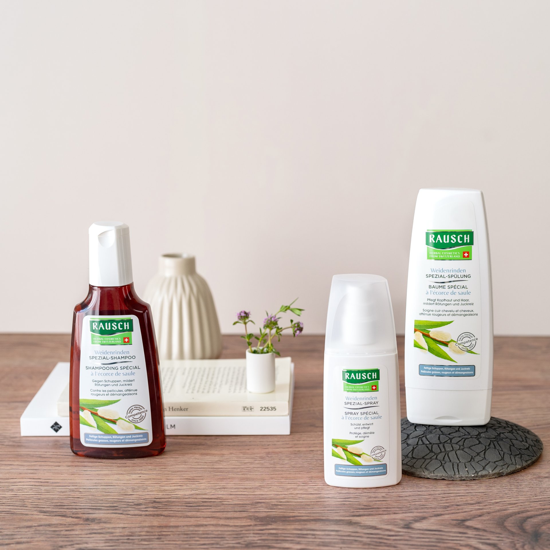 Die Weidenrinden SPEZIAL-LINIE von RAUSCH befreit die Kopfhaut nachhaltig und mild von fettigen Schuppen. Fettige Schuppen sind grösser als trockene, fühlen sich ölig an und kleben an Kopfhaut und Haaren. Sie gehen meistens mit starken Rötungen und juckender Kopfhaut einher. Die Weidenrinden SPEZIAL-LINIE wirkt effektiv und wohltuend. Zugleich mildert sie Rötungen und Juckreiz, reguliert die Kopfhautfunktionen und schützt zudem mild vor Kopflausbefall.