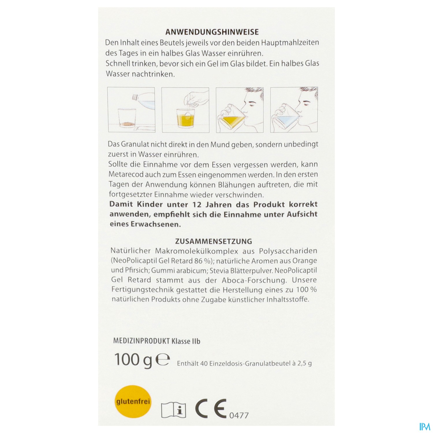 Sollte die Einnahme vor dem Essen vergessen werden, kann Metarecod auch zum Essen eingenommen werden. Das Granulat nicht direkt in den Mund geben, sondern unbedingt zuerst in Wasser einrühren.