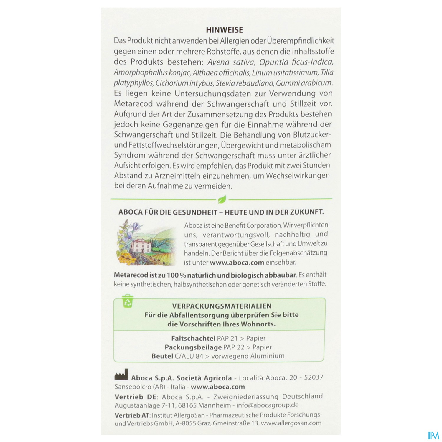 Das Produkt nicht anwenden bei Allergien oder Überempfindlichkeit gegen einen oder mehrere Rohstoffe, aus denen die Inhaltsstoffe des Produkts bestehen: Avena sativa, Opuntia ficus-indica, Amorphophallus konjac, Althaea officinalis, Linum usitatissimum, Tilia platyphyllos, Cichorium intybus, Stevia rebaudiana, Gummi arabicum. Es liegen keine Untersuchungsdaten zur Verwendung von Metarecod während der Schwangerschaft und Stillzeit vor. Aufgrund der Art der Zusammensetzung des Produkts bestehen jedoch keine Gegenanzeigen für die Einnahme während der Schwangerschaft und Stillzeit. Die Behandlung von Blutzucker- und Fettstoffwechselstörungen, Übergewicht und metabolischem Syndrom während der Schwangerschaft muss unter ärztlicher Aufsicht erfolgen. Es wird empfohlen, das Produkt mit zwei Stunden Abstand zu Arzneimitteln einzunehmen, um Wechselwirkungen bei deren Aufnahme zu vermeiden.