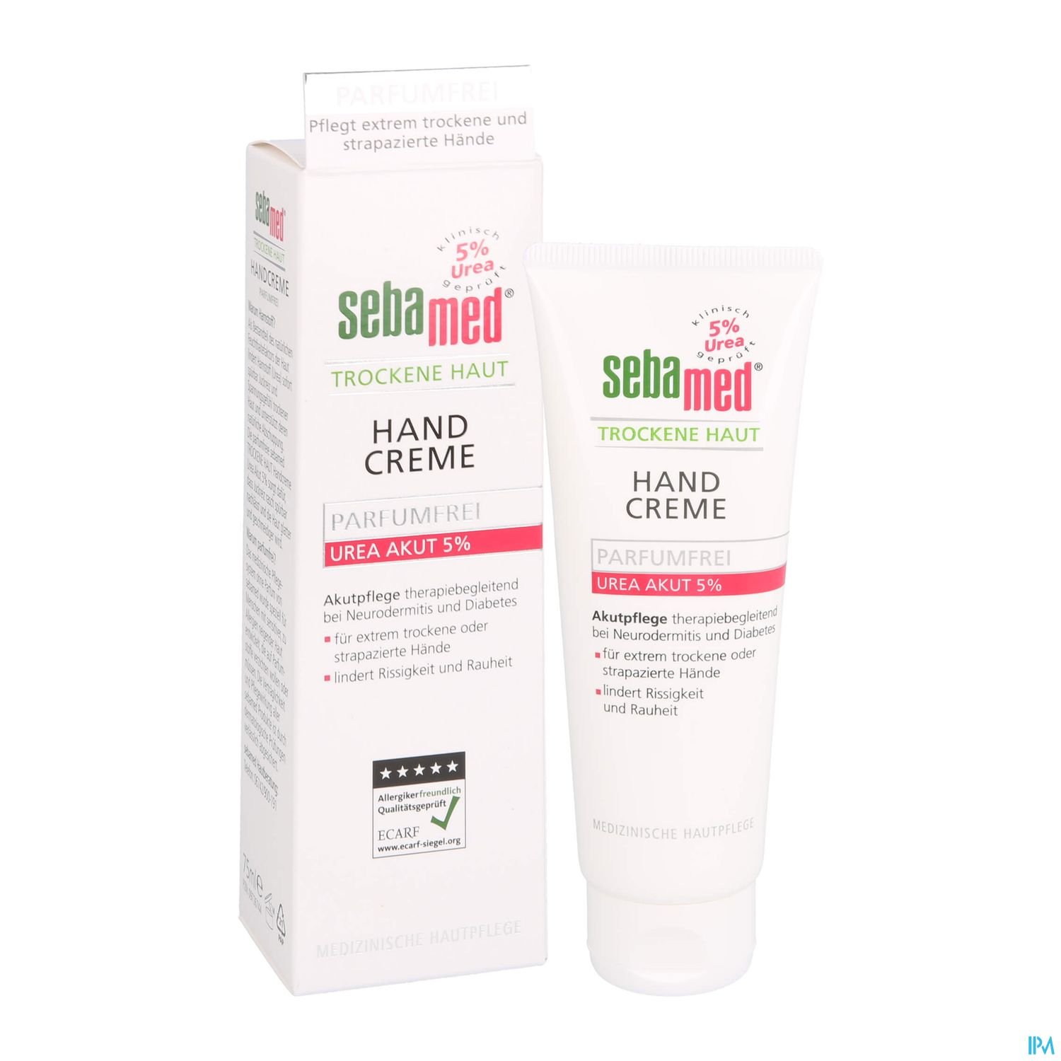 sebamed Trockene Haut Handcreme Parfumfrei Urea 5%Pflegt extrem trockene und strapazierte Hände, lindert Rissigkeit und Rauheit. Therapiebegleitend zur Handpflege bei Diabetes, Neurodermitis und Psoriasis. Die parfumfreie sebamed Trockene Haut Handcreme Urea 5% ist eine gut einziehende O/W Emulsion, die die Haut mit Feuchtigkeit versorgt und hilft, Reizungen zu mindern. Hochkonzentrierter Harnstoff (Urea) spendet intensiv Feuchtigkeit, lindert rasch Juckreiz und glättet sehr trockene Haut. Ein Wirkkomplex mit Panthenol fördert die Hautregeneration. Allantoin unterstützt die glättende und regenerierende Wirkung. Bisabolol, der Wirkstoff der Kamille, trägt zur Reizlinderung bei. Ein Lipid-Komplex aus Avocadoöl und Olivenöl verbessert die Hautglätte und trägt zum Schutz vor Austrocknung bei. Die Wirksamkeit und Verträglichkeit ist durch eine klinisch-dermatologische Anwendungsuntersuchung in einer deutschen Hautklinik bestätigt.
