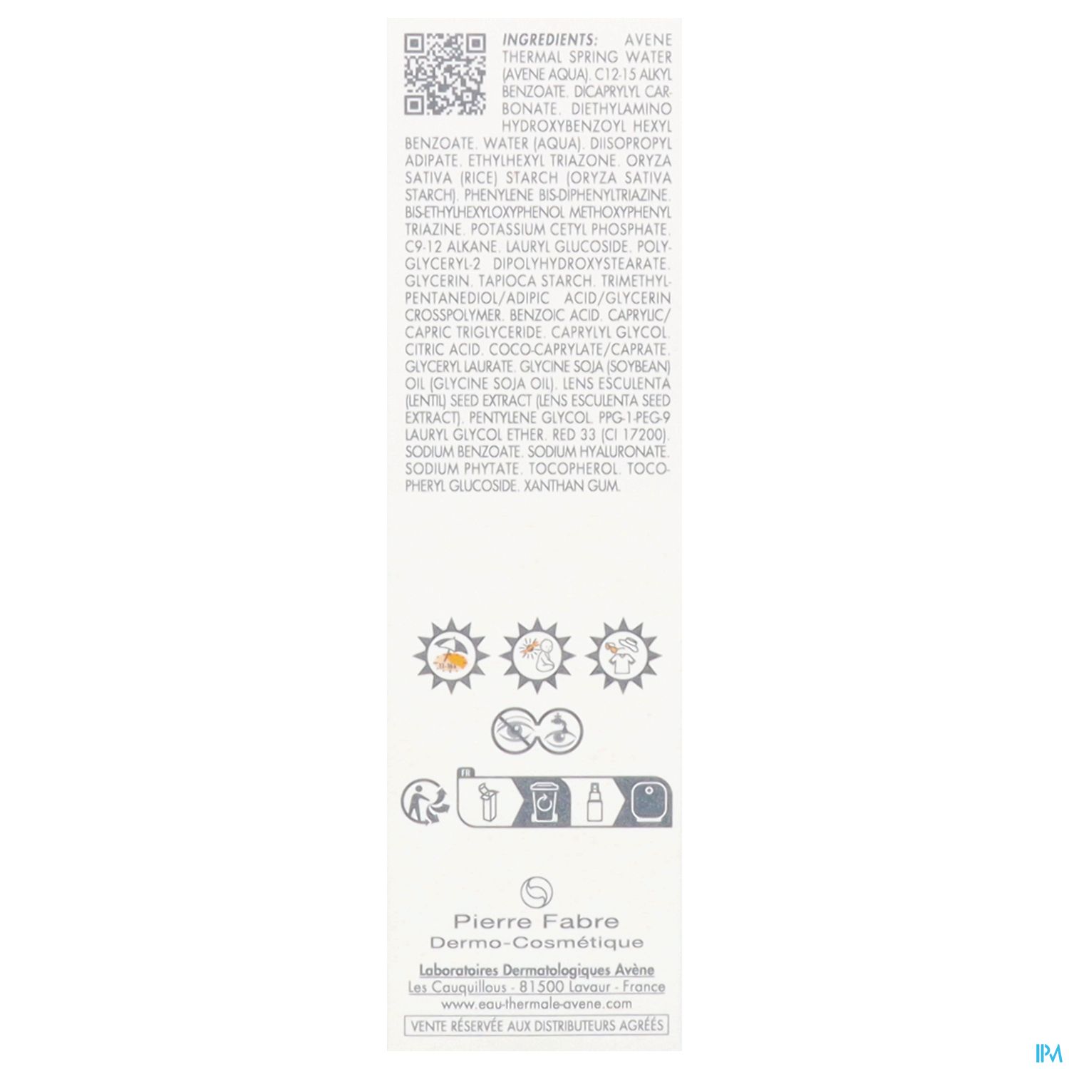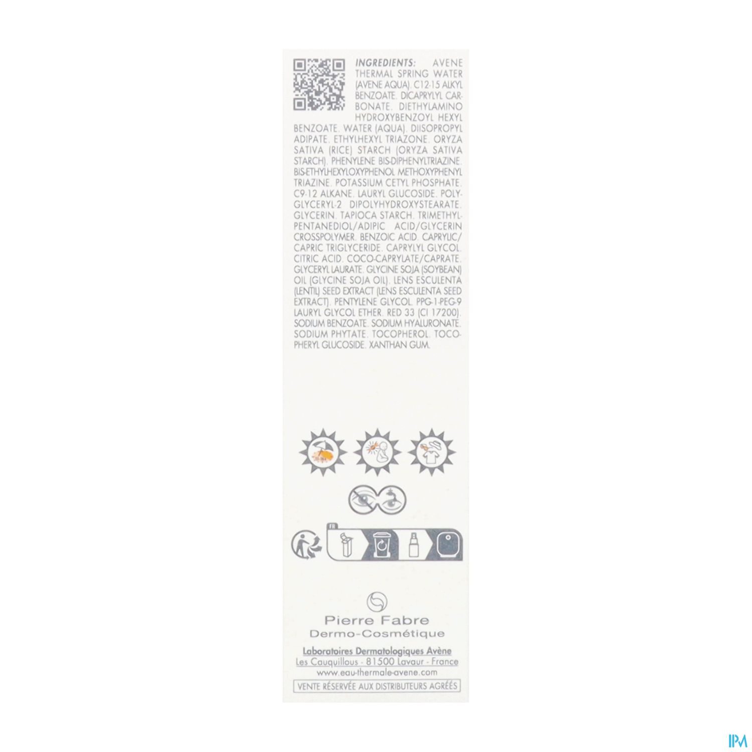 Avene Thermal Spring Water (Avene Aqua). C12-15 Alkyl Benzoate. Dicaprylyl Carbonate. Diethylamino Hydroxybenzoyl Hexyl Benzoate. Water (Aqua). Diisopropyl Adipate. Ethylhexyl Triazone. Oryza Sativa (Rice) Starch (Oryza Sativa Starch). Phenylene Bis-Diphenyltriazine. Bis-Ethylhexyloxyphenol Methoxyphenyl Triazine. Potassium Cetyl Phosphate. C9-12 Alkane. Lauryl Glucoside. Polyglyceryl-2 Dipolyhydroxystearate. Glycerin. Tapioca Starch. Trimethylpentanediol/Adipic Acid/Glycerin Crosspolymer. Benzoic Acid. Caprylic/Capric Triglyceride. Caprylyl Glycol. Citric Acid. Coco-Caprylate/Caprate. Glyceryl Laurate. Glycine Soja (Soybean) Oil (Glycine Soja Oil). Lens Esculenta (Lentil) Seed Extract (Lens Esculenta Seed Extract). Pentylene Glycol. Ppg-1-Peg-9 Lauryl Glycol Ether. Red 33 (Ci 17200). Sodium Benzoate. Sodium Hyaluronate. Sodium Phytate. Tocopherol. Tocopheryl Glucoside. Xanthan Gum