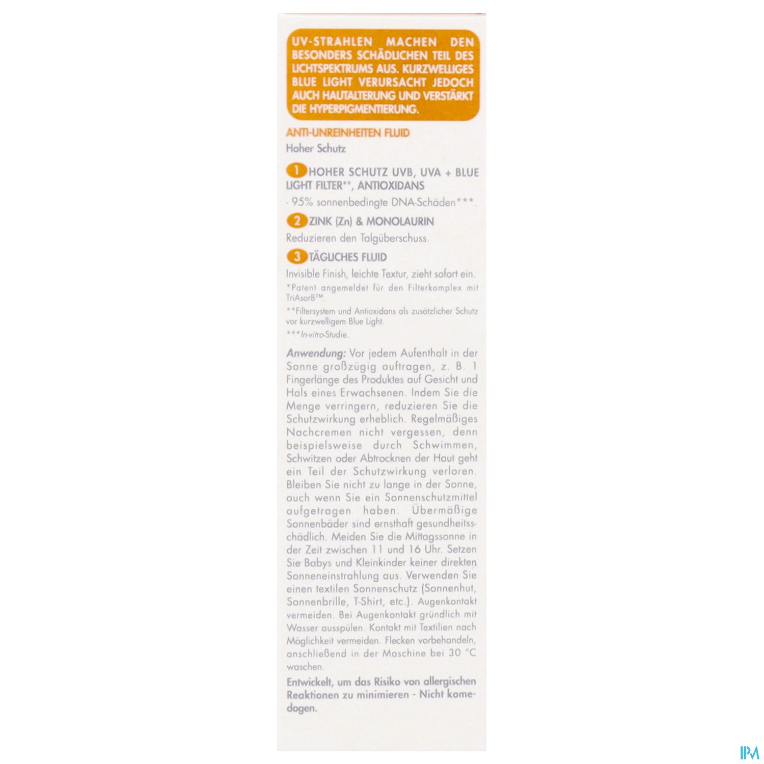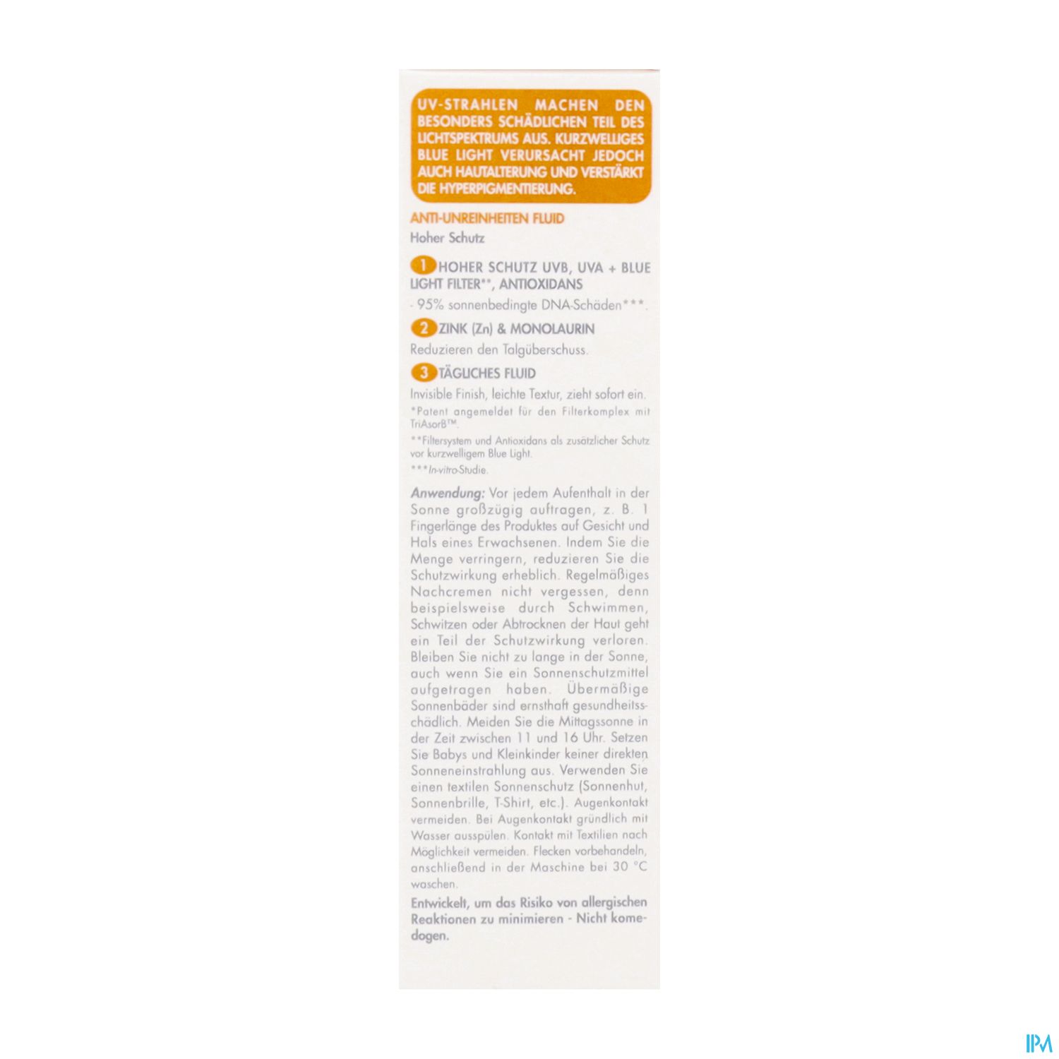 Vor der Sonnenexposition einen Finger¹ des Produkts auf Gesicht