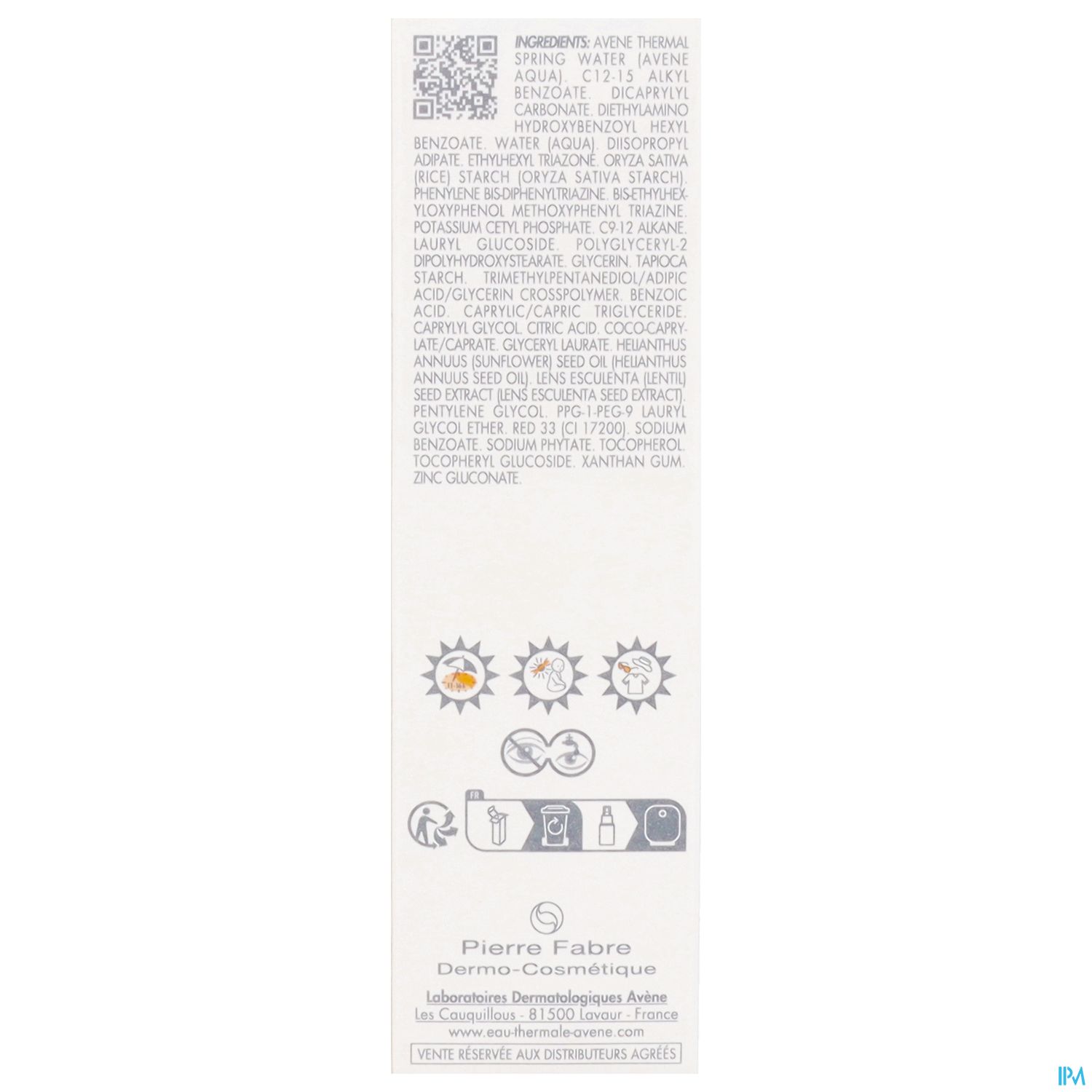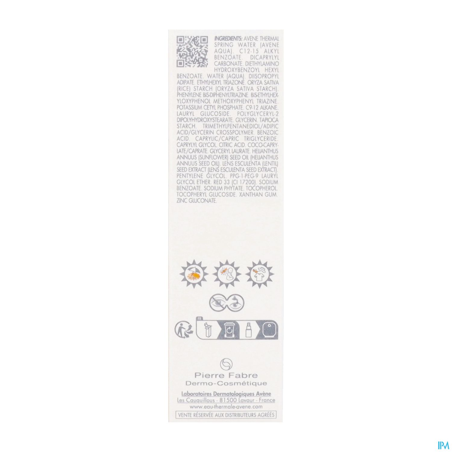 AVENE THERMAL SPRING WATER (AVENE AQUA). C12-15 ALKYL BENZOATE. DICAPRYLYL CARBONATE. DIETHYLAMINO HYDROXYBENZOYL HEXYL BENZOATE. WATER (AQUA). DIISOPROPYL ADIPATE. ETHYLHEXYL TRIAZONE. ORYZA SATIVA (RICE) STARCH (ORYZA SATIVA STARCH). PHENYLENE BIS-DIPHENYLTRIAZINE. BIS-ETHYLHEXYLOXYPHENOL METHOXYPHENYL TRIAZINE. POTASSIUM CETYL PHOSPHATE. C9-12 ALKANE. LAURYL GLUCOSIDE. POLYGLYCERYL-2 DIPOLYHYDROXYSTEARATE. GLYCERIN. TAPIOCA STARCH. TRIMETHYLPENTANEDIOL/ADIPIC ACID/GLYCERIN CROSSPOLYMER. BENZOIC ACID. CAPRYLIC/CAPRIC TRIGLYCERIDE. CAPRYLYL GLYCOL. CITRIC ACID. COCO-CAPRYLATE/CAPRATE. GLYCERYL LAURATE. HELIANTHUS ANNUUS (SUNFLOWER) SEED OIL (HELIANTHUS ANNUUS SEED OIL). LENS ESCULENTA (LENTIL) SEED EXTRACT (LENS ESCULENTA SEED EXTRACT). PENTYLENE GLYCOL. PPG-1-PEG-9 LAURYL GLYCOL ETHER. RED 33 (CI 17200). SODIUM BENZOATE. SODIUM PHYTATE. TOCOPHEROL. TOCOPHERYL GLUCOSIDE. XANTHAN GUM. ZINC GLUCONATE