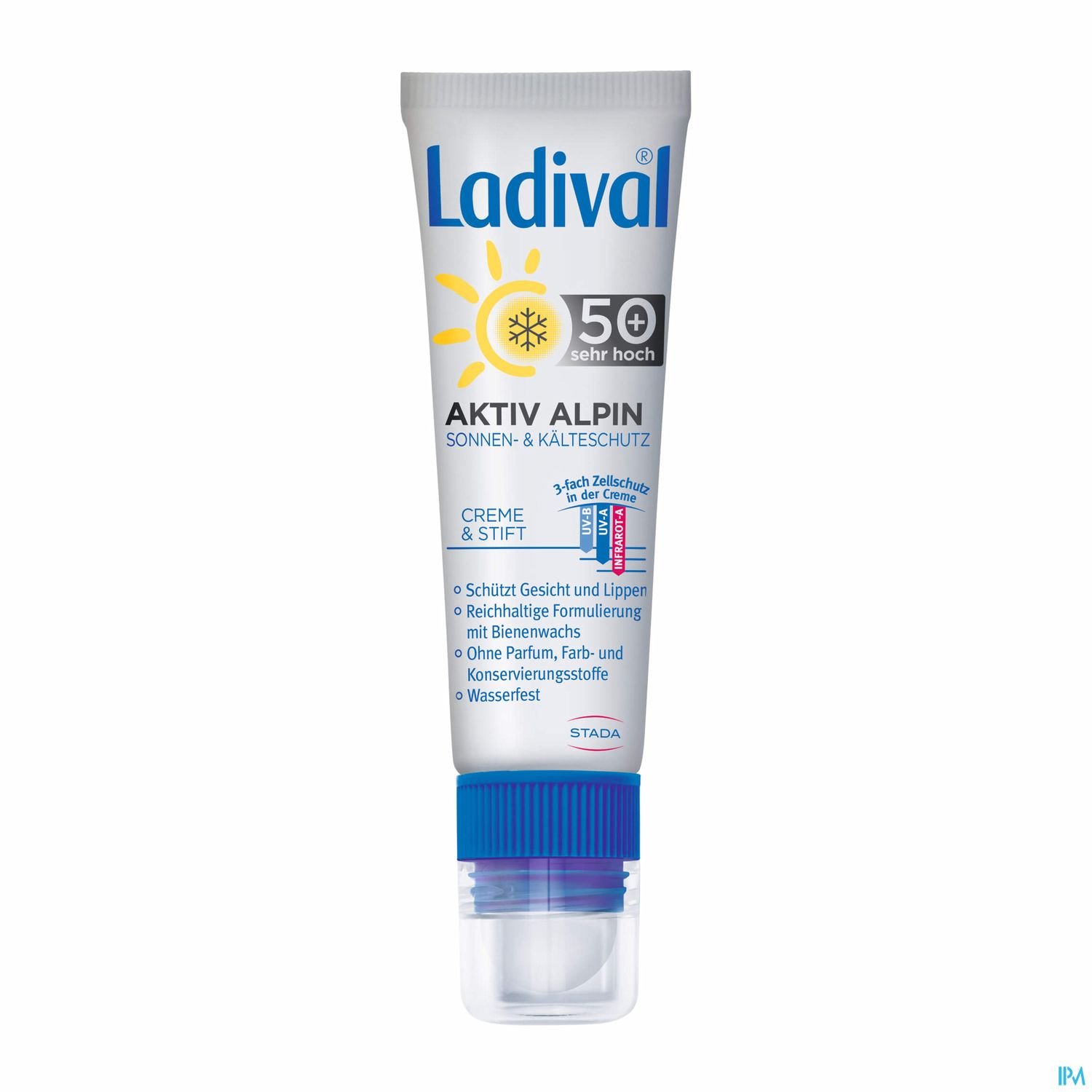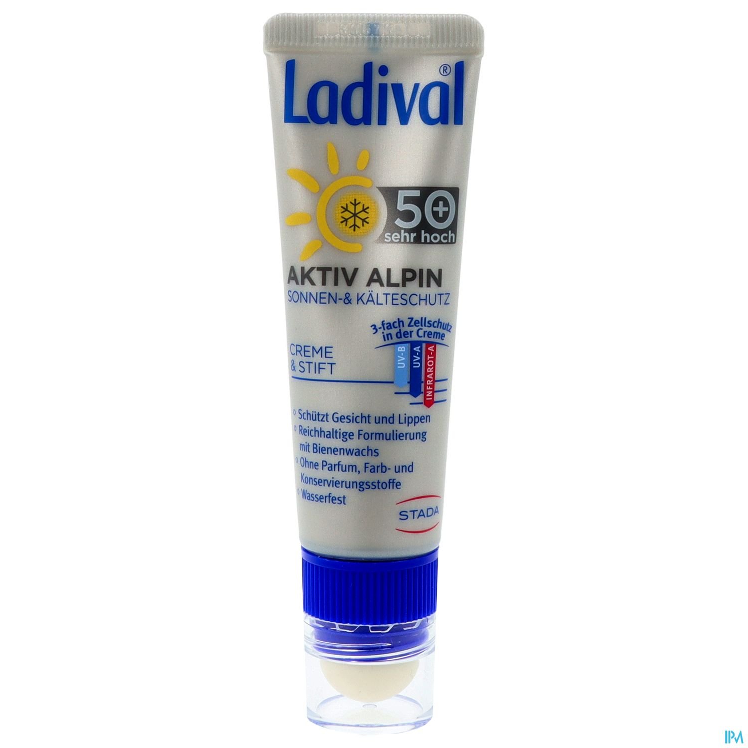 Ladival Alpin Sonnencreme2-in-1 Aktiv Alpin Sonnen- und KälteschutzDie Ladival Aktiv Alpin ###Winter-Kombi### schützt Gesicht und Lippen vor Sonne dank sehr hohem Lichtschutzfaktor, vor Kälte bis -18°C und zusätzlich vor Austrocknung. Die Sonnenschutzkombination der Alpin Sonnencreme ist besonders praktisch für unterwegs und nicht nur für Wintersportler. Handlicher Sonnenschutz für alle, die gerne im Winter draußen aktiv sind.Ladival Aktiv Sonnen- und Kälteschutz für Gesicht und Lippen: