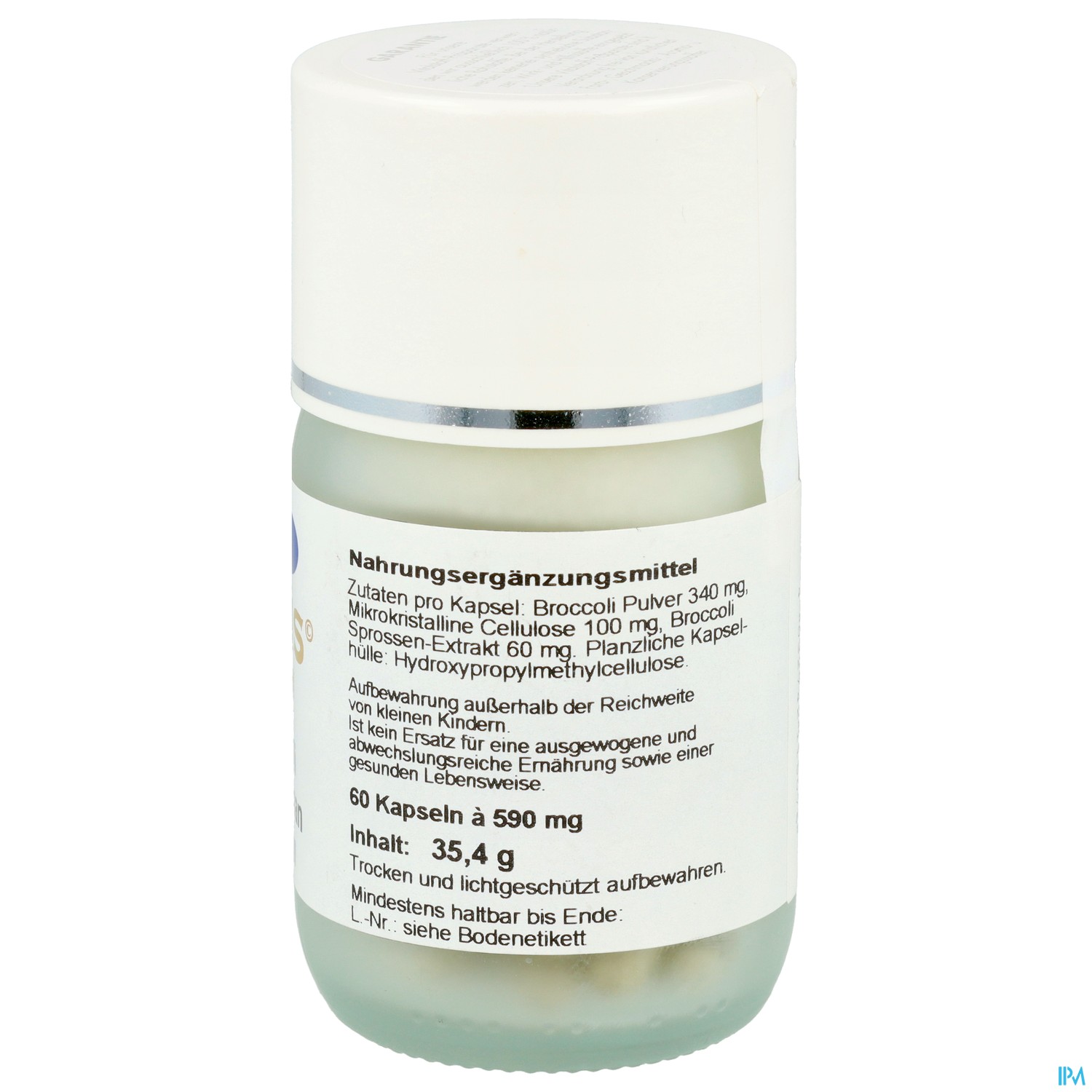 Zutaten pro Kapsel:Broccoli Pulver 340 mg, Broccoli Sprossen-Extrakt 60 mg, Mikrokristalline Cellulose 60 mg. (Pro Kapsel 6 mg Sulforaphan)
