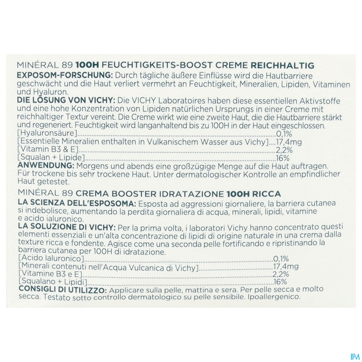 - Die Vichy MINÉRAL 89 100H Feuchtigkeits-Boost Creme mit Duft versorgt die Haut intensiv mit Feuchtigkeit und stärkt ihre Widerstandskraft. Dank der Kombination aus Hyaluronsäure, Mineralien, Lipiden und Vitaminen bleibt die Haut bis zu 100 Stunden hydratisiert und besser geschützt vor äußeren Belastungen.