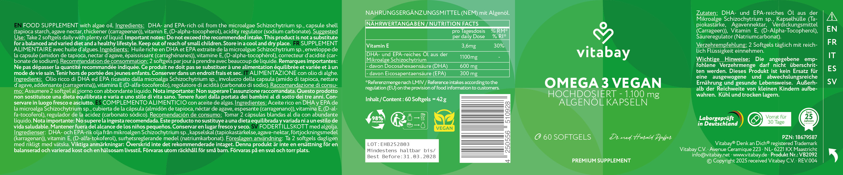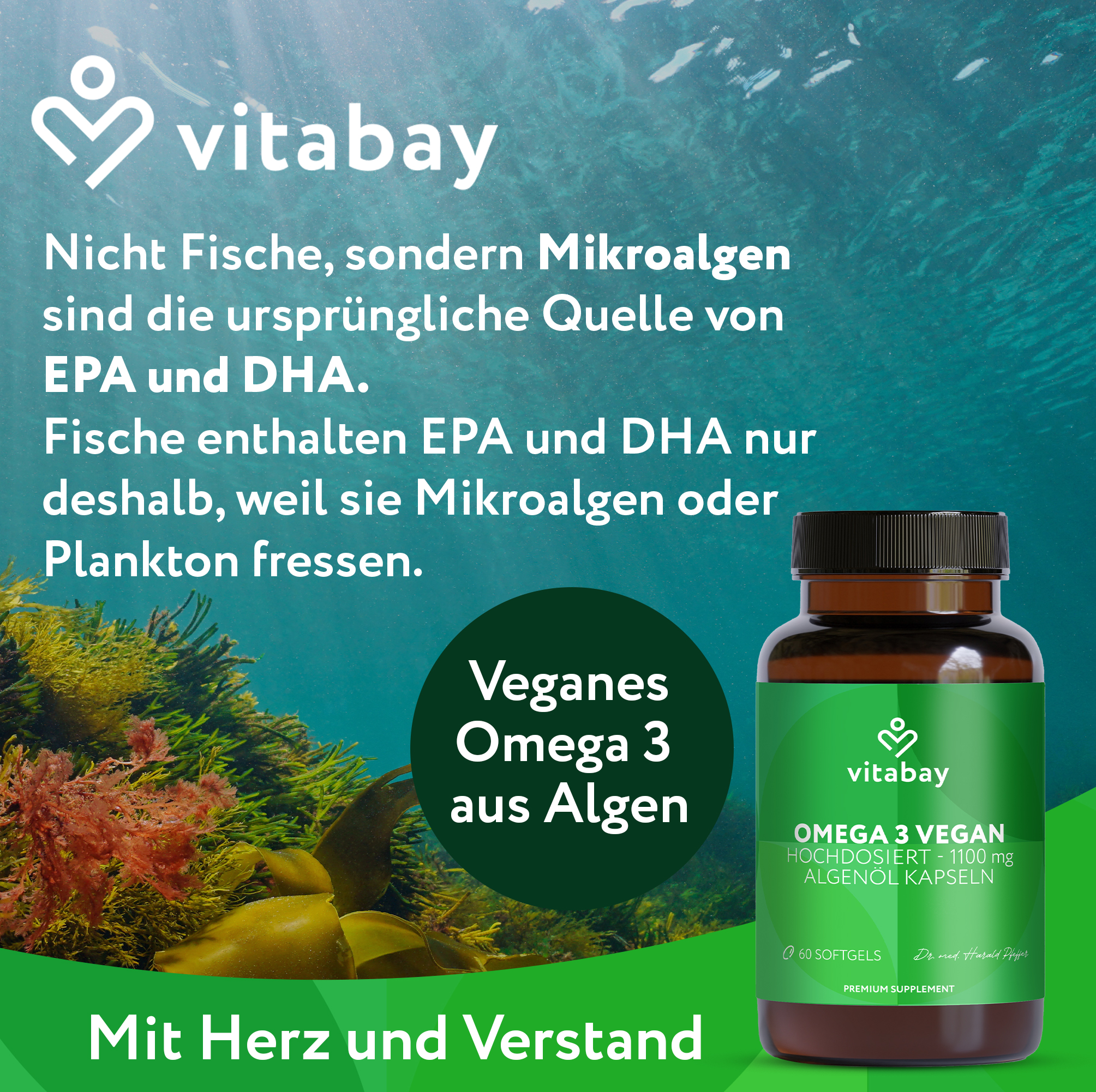Vitabay Omega 3 Vegan Hochdosiert - 1.100mg - Algenöl Kapseln (60 Stk.)