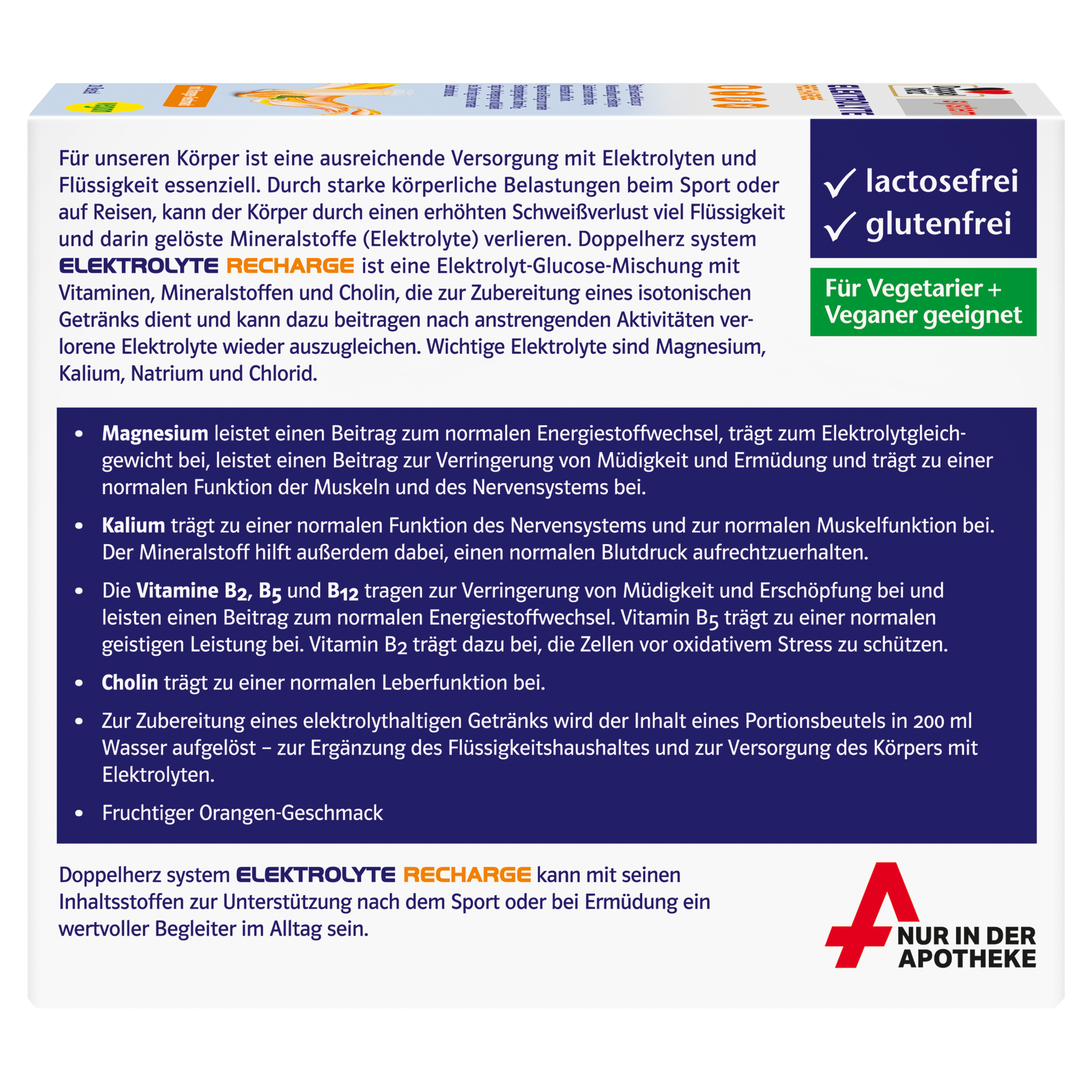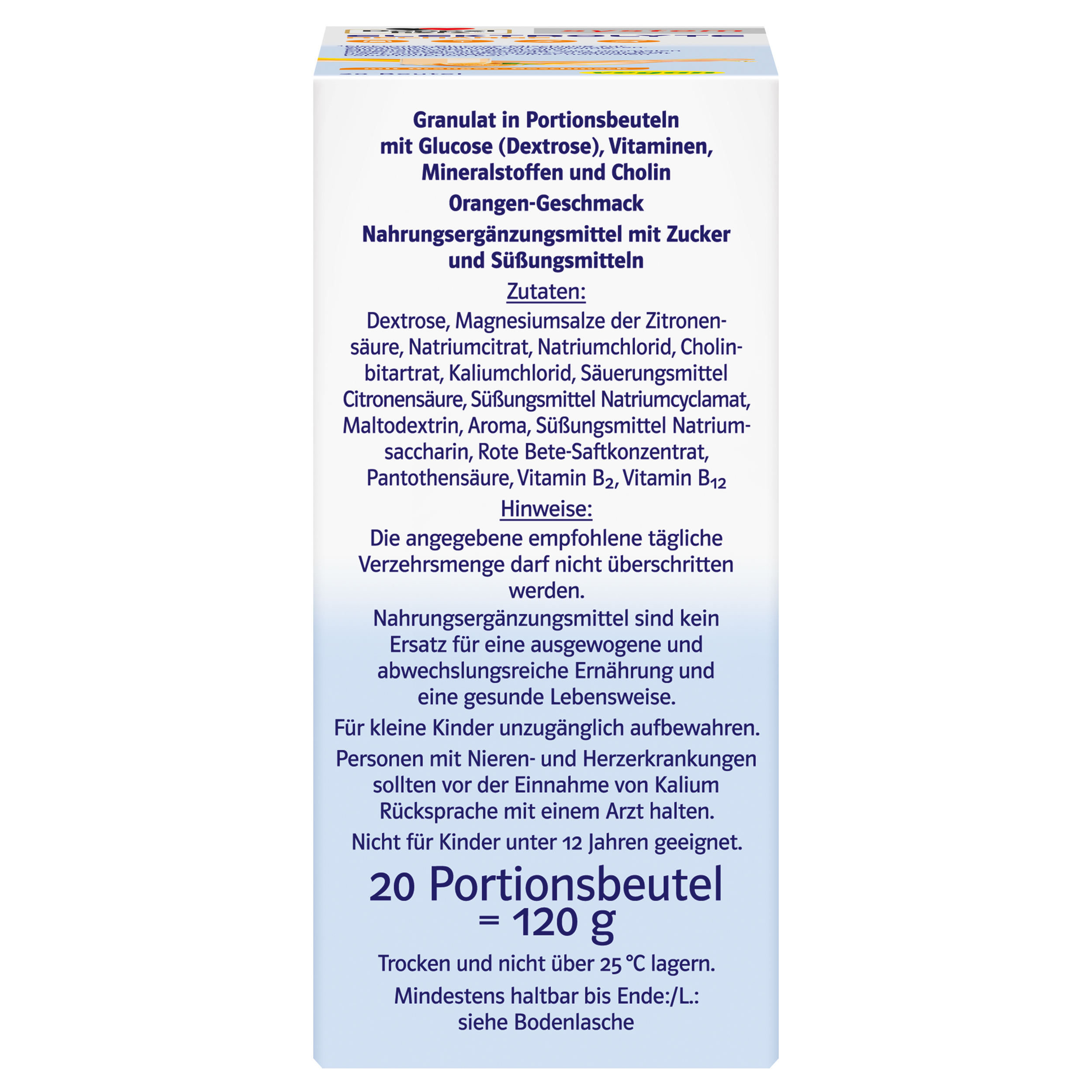 Der Inhalt eines Beutels wird in 200 ml Wasser zur Zubereitung eines elektrolythaltigen mit fruchtigem Orangen-Geschmack aufgelöst. Für unseren Körper ist eine ausreichende Versorgung mit Elektrolyten und Flüssigkeit essenziell. Durch starke körperliche Belastungen beim Sport oder auf Reisen, kann der Körper durch einen erhöhten Schweißverlust viel Flüssigkeit und darin gelöste Mineralstoffe (Elektrolyte) verlieren. Magnesium leistet einen Beitrag zum normalen Energiestoffwechsel, trägt zum Elektrolytgleichgewicht bei, leistet einen Beitrag zur Verringerung von Müdigkeit und Ermüdung und trägt zu einer normalen Funktion der Muskeln und des Nervensystems bei. Kalium trägt zu einer normalen Funktion des Nervensystems und zur normalen Muskelfunktion bei. Der Mineralstoff hilft außerdem dabei, einen normalen Blutdruck aufrechtzuerhalten. Die Vitamine B2, B5 und B12 tragen zur Verringerung von Müdigkeit und Erschöpfung bei und leisten einen Beitrag zum normalen Energiestoffwechsel. Vitamin B5 trägt zu einer normalen geistigen Leistung bei. Vitamin B2 trägt dazu bei, die Zellen vor oxidativem Stress zu schützen. Cholin trägt zu einer normalen Leberfunktion bei.