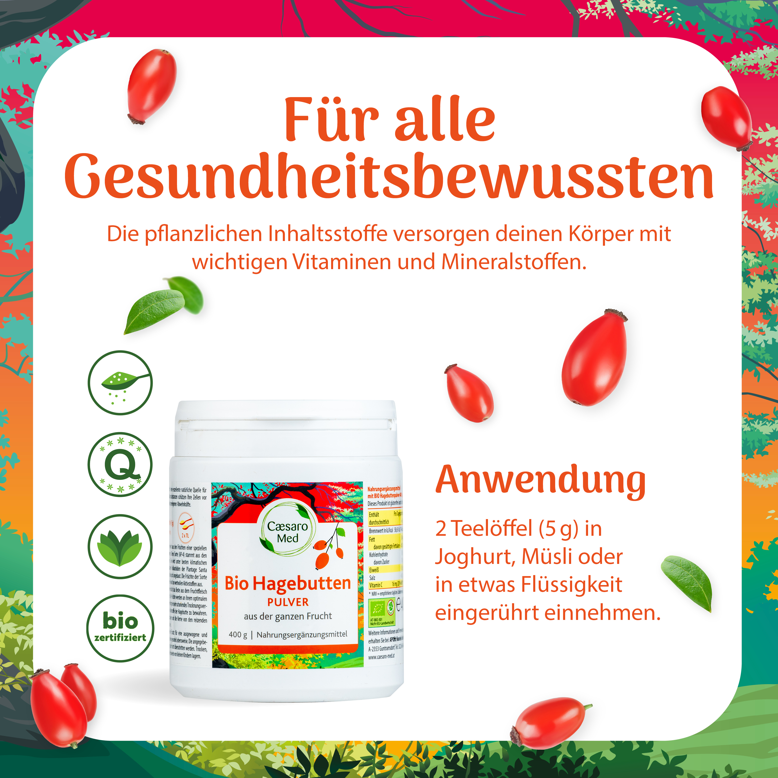Hagebuttenpulver Caesaro Med ist auf schone Weise aus den ganzen Früchten hergestellt um ein Höchstmaß an den wichtigen Inhaltsstoffen im stabilen trockenen Zustand zu erhalten.