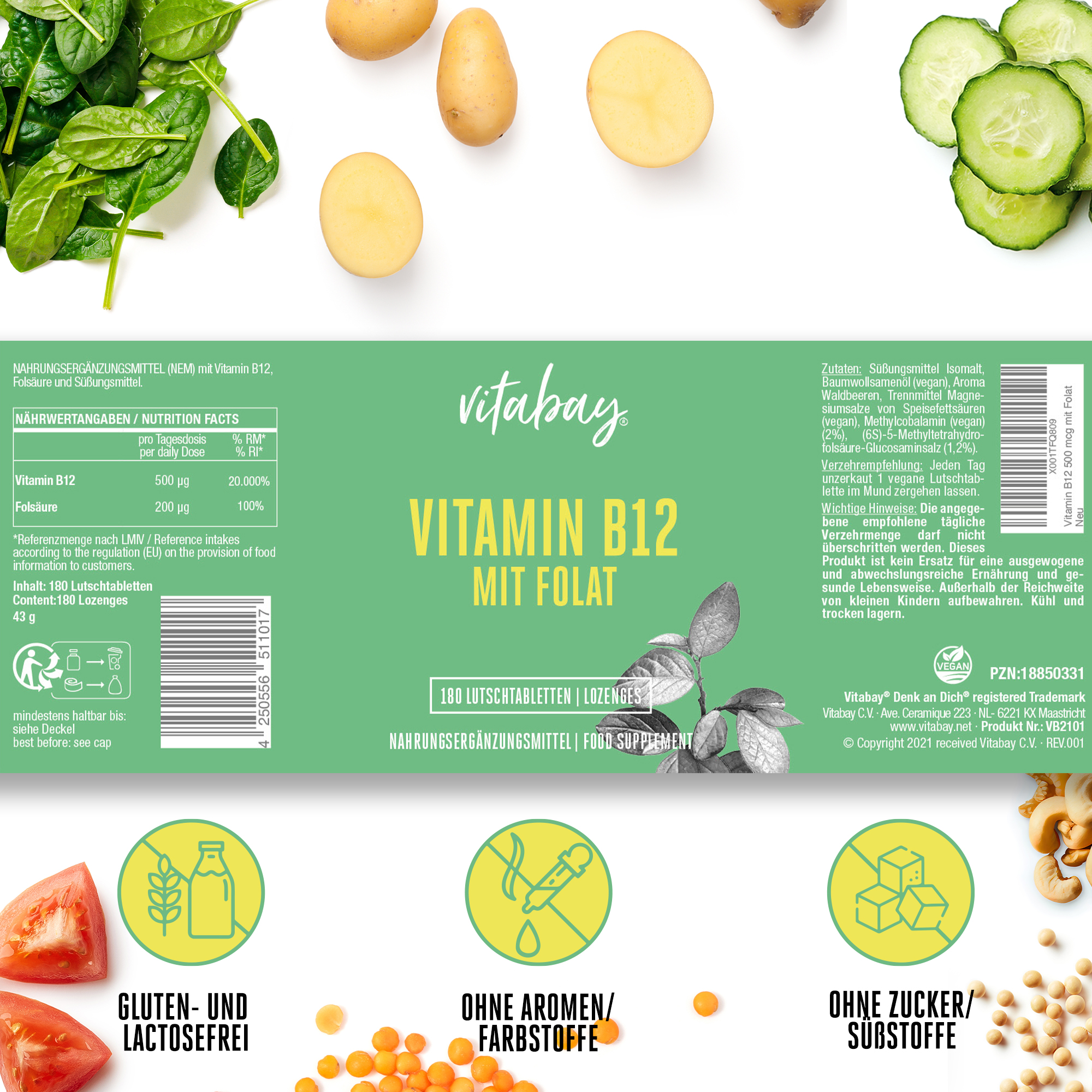 Vitamin B12 mit Folat von Vitabay ist ein Nahrungsergänzungsmittel mit 500 µg Vitamin B12 und 200 µg Folsäure pro Tablette. Das Produkt ist vegan und enthält 180 Lutschtabletten.
