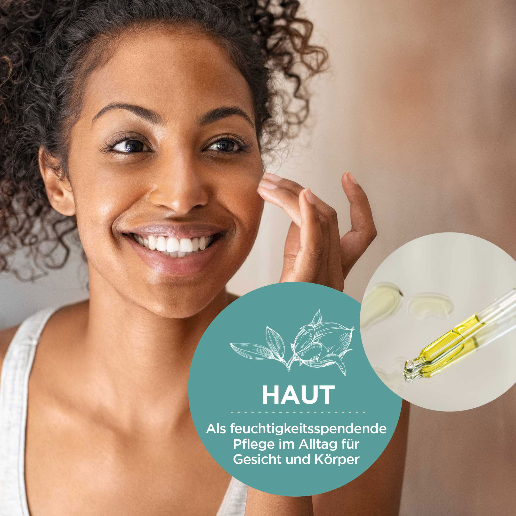 Jojobaöl ist reich an wertvollen Inhaltsstoffen. Es ist ideal für deine Körperpflege und kann vielseitig angewendet werden. Als Jojobaöl Gesicht glättet und strafft es deine Haut, als Jojobaöl Haare verleiht es deinem Haar natürlichen Glanz und repariert zudem brüchige Nägel. Die angenehme und ergiebige Textur des Jojobaöls zieht leicht und ohne Rückstände tief ein und entfaltet ihre intensive Wirkung von innen heraus. Dank des hohen Gehalts an Vitamin E wirkt das Jojobaöl antioxidativ und hautschützend.