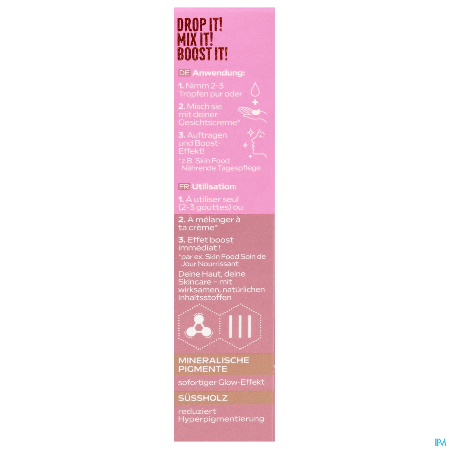 2 bis 3 Tropfen pur auf die Haut geben oder mit der Gesichtscreme, zum Beispiel mit der Skin Food Nährenden Tagespflege, mischen. Sanft in die Haut einmassieren und den Boost-Effekt erleben.