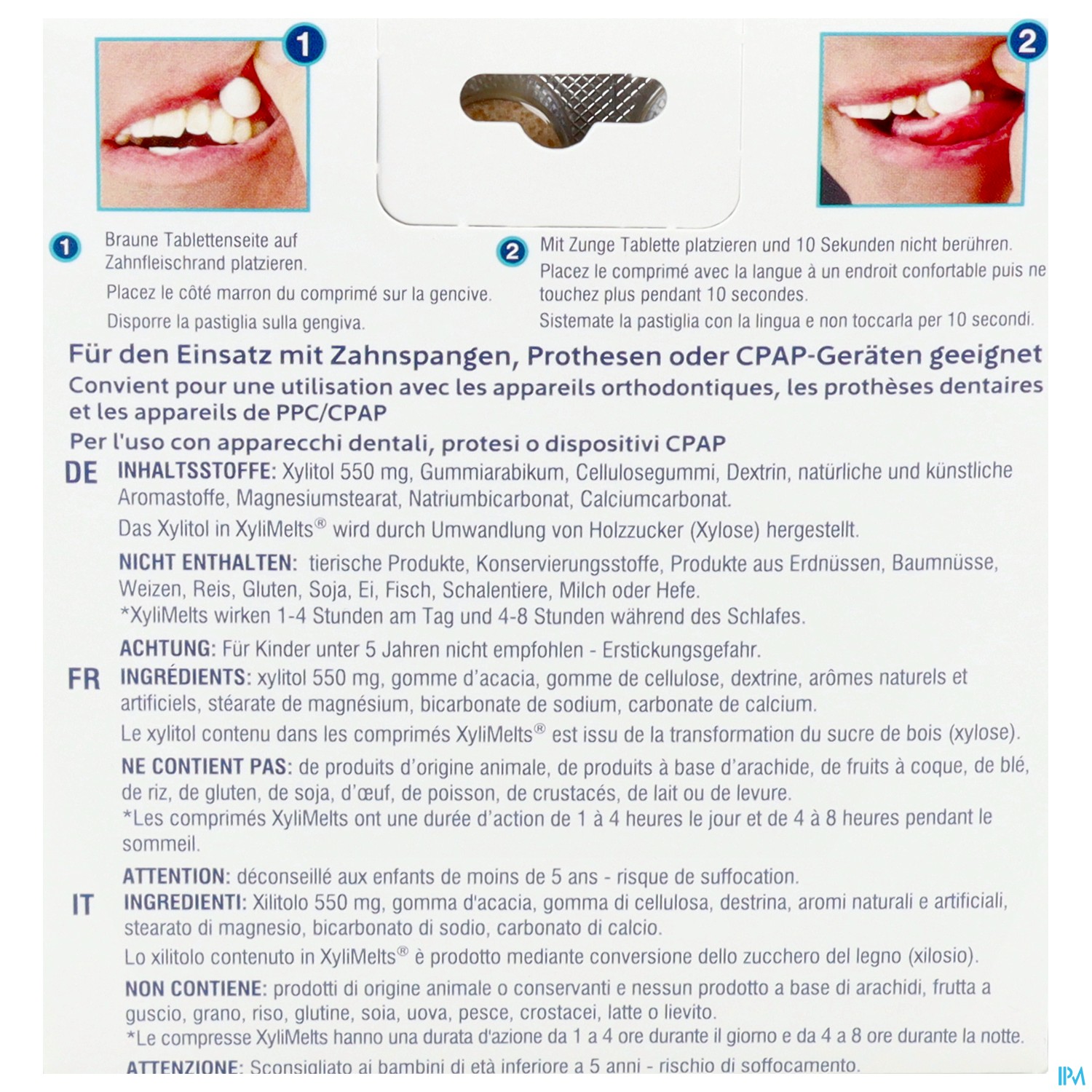 Was sind XyliMelts? XyliMelts sind Haftscheiben, die an Zähnen oder Zahnfleisch haften und so anhaltende Mundtrockenheit lindern. Verwenden Sie XyliMelts tagsüber oder nachts und erleben Sie vorübergehende Linderung bei häufigem Durst, klebriger Trockenheit in Mund und Rachen sowie anderen unangenehmen Symptomen von Mundtrockenheit. Hergestellt mit Xylit, einem natürlichen Süßstoff, der den Speichelfluss anregt, geben XyliMelts dank ihrer Haftscheibentechnologie 550 mg Xylit langsam und gleichmäßig ab. Die Wirkung ist am stärksten, wenn Xylit kontinuierlich freigesetzt wird und länger im Mund verbleibt, insbesondere bei Anwendung im Schlaf, wenn der Speichelfluss am geringsten ist. XyliMelts wirken stundenlang, befeuchten und umhüllen den Mund für optimalen Komfort. Der milde Minzgeschmack erfrischt den Atem, und das enthaltene Xylit kann das Risiko von Karies verringern.